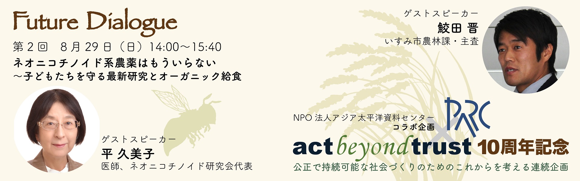 そこでFuture Dialogueの第2回は、ネオニコチノイド研究の第一線に立つ平久美子医師と有機米の学校給食を実現した千葉県いすみ市の職員・鮫田晋さんをお迎えし、平医師からはネオニコの人体影響最前線について、鮫田さんからは市民や行政による有機学校給食の普及についてお話しいただきます。また、お二人にabtメンバーを交えた対話の時間を設け、ネオニコを使用しない農作物やオーガニック食品をすべての人が享受できる公正な社会への転換についても考えます。