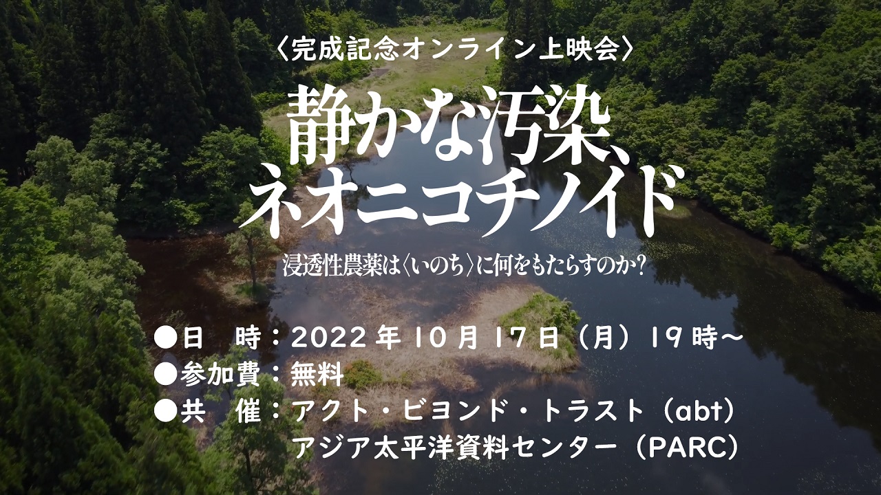 浸透性農薬ネオニコチノイドのはらむ問題について生態系への影響と人体への安全性の両面から迫った、PARC制作の新作映像作品『静かな汚染、ネオニコチノイド―浸透性農薬は〈いのち〉に何をもたらすのか?』を上映。