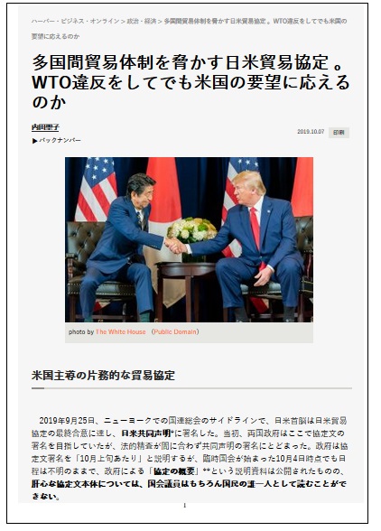 寄稿「多国間貿易体制を脅かす日米貿易協定 。WTO違反をしてでも米国の要望に応えるのか」(ハーバービジネスオンライン)