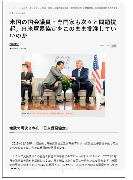 寄稿「米国の国会議員・専門家も次々と問題提起。日米貿易協定をこのまま批准していいのか」(ハーバービジネスオンライン)