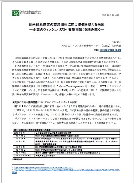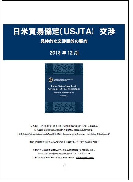2018年12月21日、米国通商代表部(USTR)は、「日米貿易協定交渉の目的の要約」(以下、「交渉の目的」)と題された文書 を公表した。