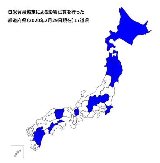一方、政府が日本全体への影響試算を出し、協定の国会審議が始まった2019年10月以降、各道県で独自の試算が順次発表されていった。2020年2月19日現在、17の道県がその数値を公表している(下記地図参照)。各道県の試算も、基本的に上記の政府の試算項目・算出方法に準じているため、結果の金額については留保が必要であろう。最も影響を受ける北海道では、全国最大の影響額となる235〜371億円となったが、それでも農家の中には「国や道の想定は甘い」と疑問視する声もあがっているという(日米協定と農業 甘すぎる道の影響試算」北海道新聞 2019年11月24日)。